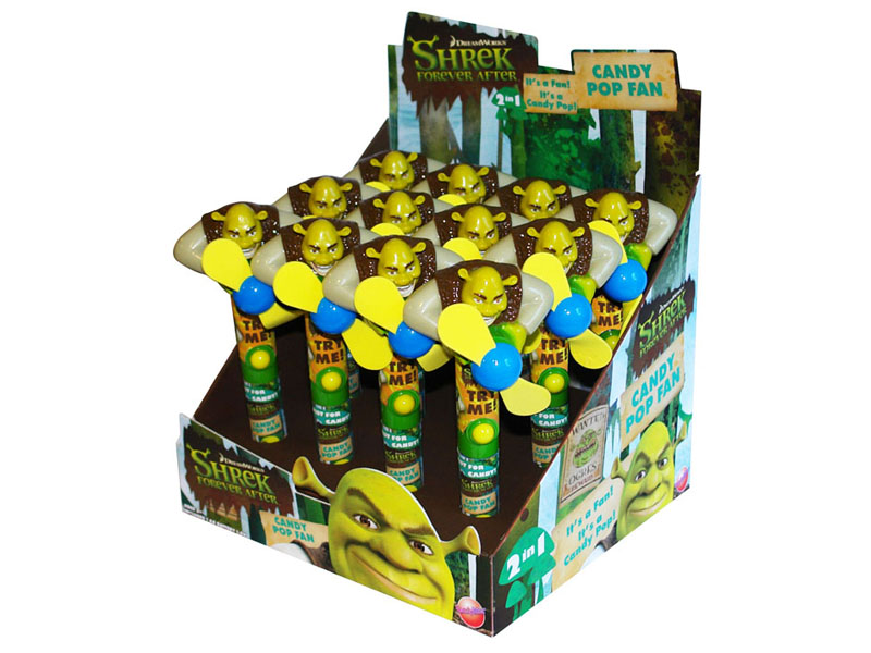 Item 10597: Keep an eye on Shrek the ogre as this powerful, child-safe fan spins. Lollipop in the handle. Packed (6) 12 count displays per case.