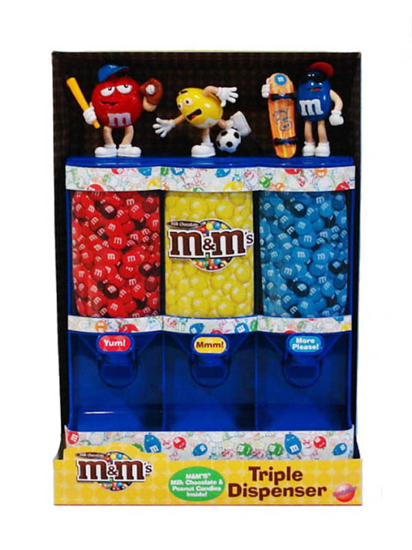 Item 30962: Triple the M&M fun!! M&M sports characters are featured on this triple M&M dispenser. Includes 3 fun size packes of M&M's. Packed 6 displays per case.