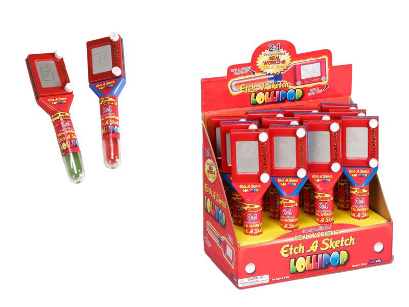 1174- DISCONTINUED This nostalgic item combines the fun of a mini Etch-A-Sketch with a delicious lollipop in the handle! Packed (6) 12 count displays per case.