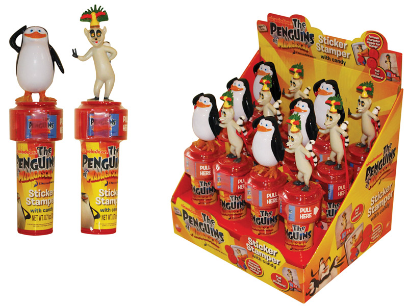 Item 10757: King Julien and the penguins from Penguins of Madagascar sit atop these fun sticker stampers! Pull the top off for a great rubber stamper and pull the stickers out and stick them to everything! Comes with microbites candy in the handle. Packed (6) 12 count displays per case.