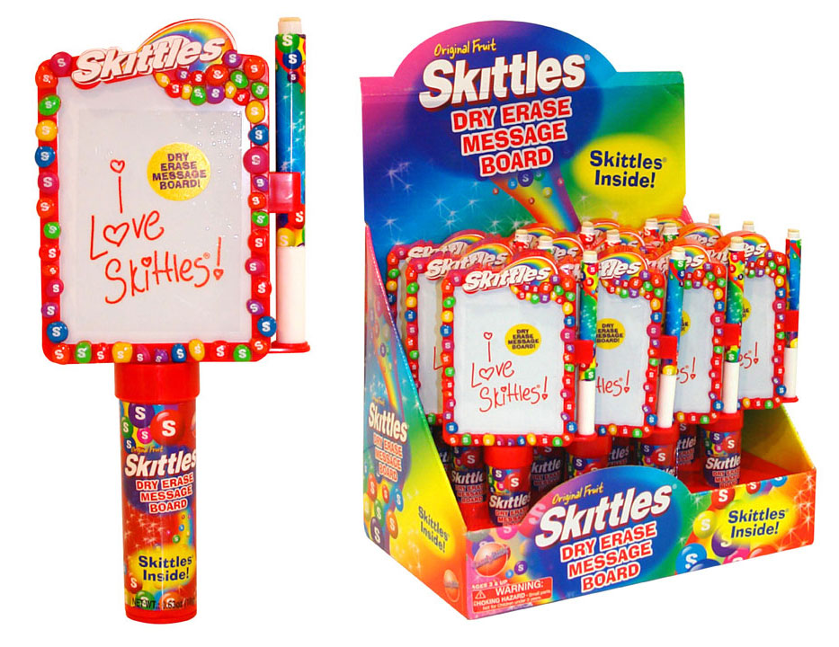 Item 5022: Write On, Wipe Off- Skittles dry erase Message Board with a mini Skittles pack in the handle. Packed (6) 12 count displays per case