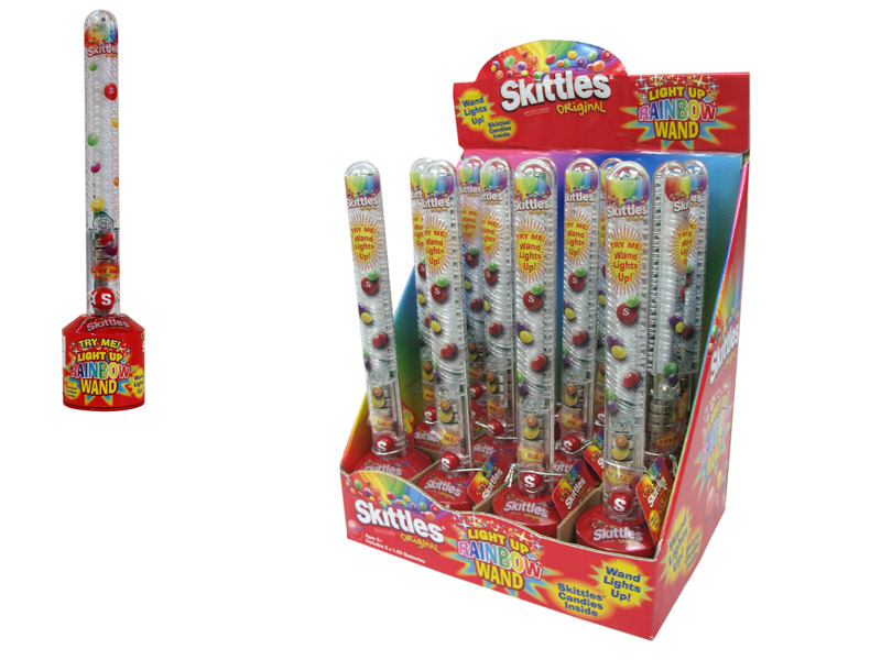 Item 19485- Taste the rainbow! This exciting new Skittles Rainbow Wand lights up in three different lighting patterns. Wave it though the air in the dark and it creates a rainbow. Auto shut off in 10 seconds. Great Try Me Feature. Be seen after dark with rainbow of colors. Base contains one bag of Skittles. Packed (6) 12 count displays per case.