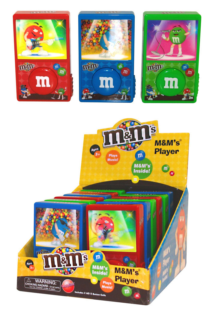 Item 10047: Your favorite M&M characters belting out tunes in these MP3 shaped toys. Press the button to hear a tune. M&M's in the back. Packed (6) 12 count displays per case.