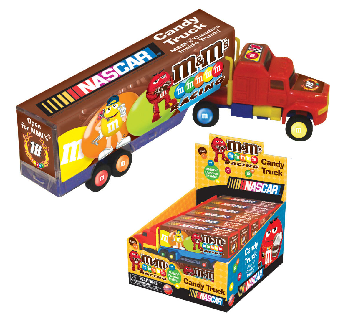 Item 4728: This awesome moveable semi truck features #18 for Kyle Busch and has a mini pack of M&M's in the trailer! Packed (6) 12 count displays per case.
