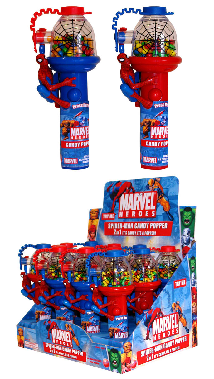 Spider-Man hangs on while kids watch the candy jump inside the dome when they push the button; Watch the candy fly into their hands or directly into their mouths! Replaceable battery and kids can refill the candy. Loads of fun and lots of play value. Packed 6/12's per case. #4391